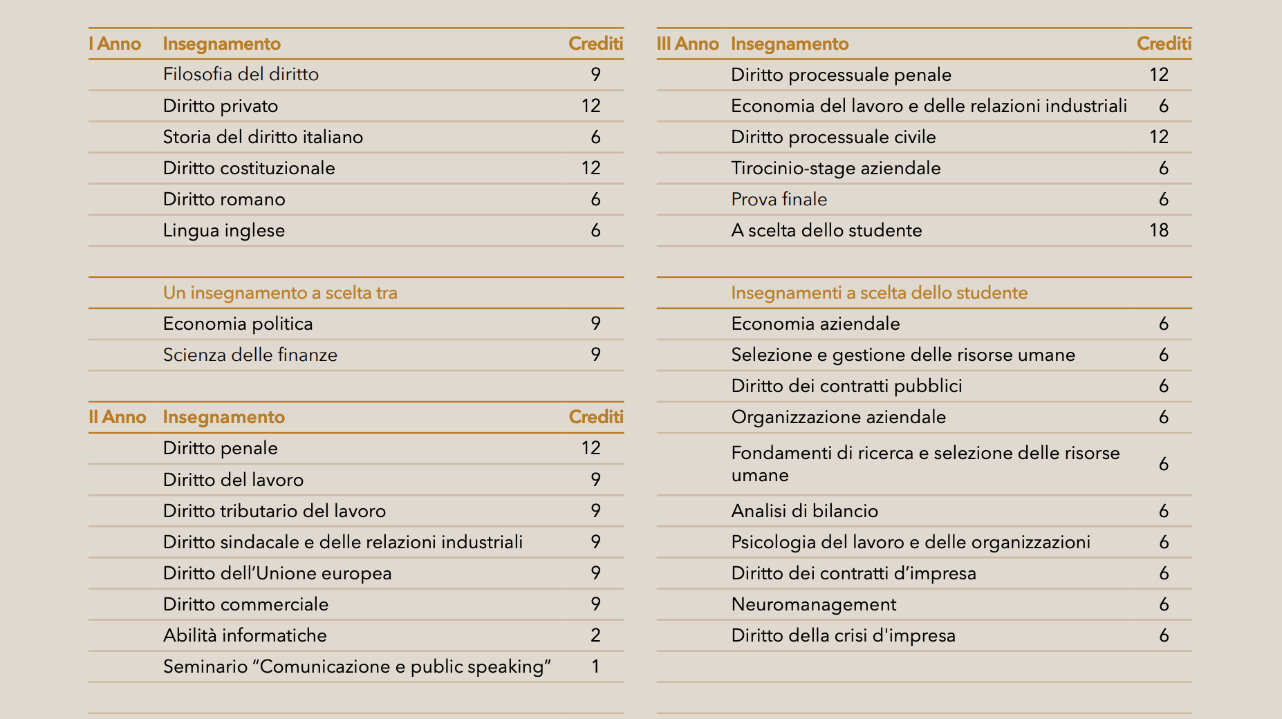 Il percorso formativo è articolato in tre anni. Il primo anno prevede materie giuridiche, economiche e lo studio della lingua inglese; il secondo anno prevede l'approfondimento delle conoscenze e competenze giuridiche, in particolare nei campi del diritto del lavoro, del diritto commerciale e del diritto tributario; il terzo anno, oltre a perfezionare la formazione in ambito sia economico che giuridico, consente di personalizzare il percorso di studi in base ai propri interessi attraverso la scelta di tre insegnamenti selezionabili tra un'ampia serie di opzioni. Il corso prevede, tra l'altro: