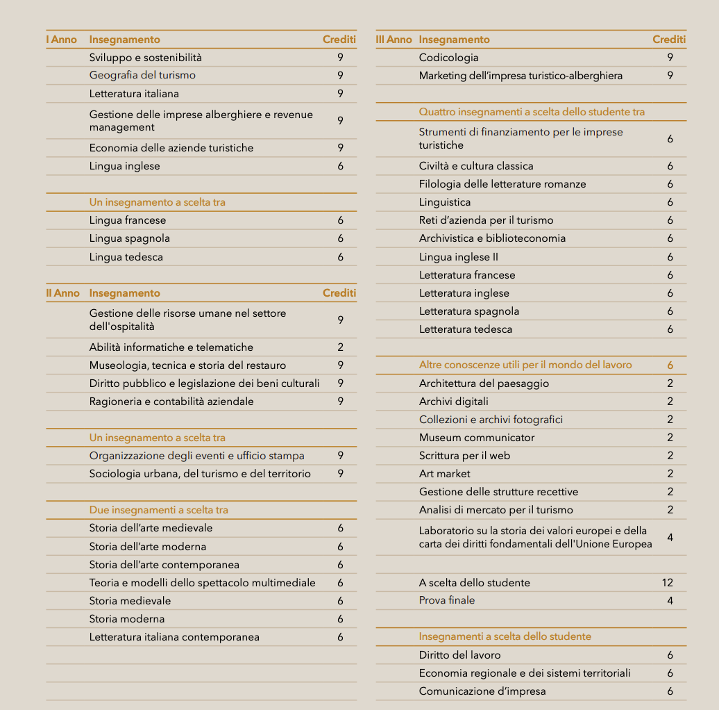 Il corso è organizzato in tre anni e consente di acquisire conoscenze e capacità di base in due ambiti principali: quello manageriale, applicato alla gestione dei sistemi ricettivi e dell'ospitalità, al revenue management, all'organizzazione del personale nel settore dell'ospitalità, al marketing dell'impresa turistico-alberghiera; quello storico-artistico-letterario, che completa il profilo del laureando. Prevede, inoltre, insegnamenti di ambito geografico e sociologico, fornisce competenze di base di carattere informatico e consente di apprendere due o più lingue straniere. Prevede attività seminariali che forniscono ulteriori conoscenze e capacità utili ai fini dell'inserimento nel mondo del lavoro. Il primo anno prevede insegnamenti su discipline di base e caratterizzanti che consentono di acquisire gli strumenti fondamentali sulla gestione delle imprese alberghiere, sul revenue management, nonché le conoscenze di carattere economico, geografico, artistico, della lingua inglese e di altra lingua a scelta dello studente. Il secondo anno prevede insegnamenti di base e caratterizzanti volti ad approfondire i temi inerenti alle organizzazioni aziendali e alla gestione delle risorse umane nel settore dell'ospitalità, agli aspetti sociologici del turismo e alla legislazione dei beni culturali. Lo studente può scegliere tra diversi insegnamenti di ambito storico-artistico. Il terzo anno consente di approfondire le conoscenze di carattere manageriale, letterario e/o linguistico, potendo scegliere tra diversi insegnamenti. Lo studente può approfondire il livello di conoscenza dell'inglese oppure ampliare le conoscenze letterarie di una specifica regione europea. Il corso non prevede tirocini curriculari.