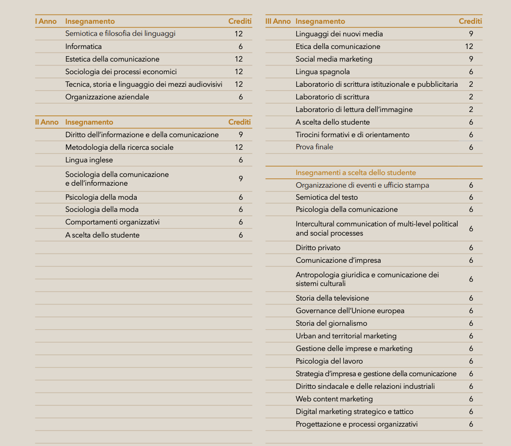 Il percorso di studi si struttura su tre anni: il primo anno affronta temi trasversali come semiotica e filosofia dei linguaggi, estetica della comunicazione, informatica, tecnica, storia, e linguaggio dei mezzi audiovisivi. Il secondo anno scende nel dettaglio di alcune discipline come la psicologia e la sociologia della moda ampliando le conoscenze dello studente nell'ambito della comunicazione grazie a discipline come il diritto dell'informazione e della comunicazione o la sociologia della comunicazione e dell'informazione. L'ultimo anno prevede la partecipazione a laboratori tematici, che vanno dalla scrittura istituzionale e pubblicitaria alla lettura dell'immagine, e si conclude con tirocini formativi e di orientamento.