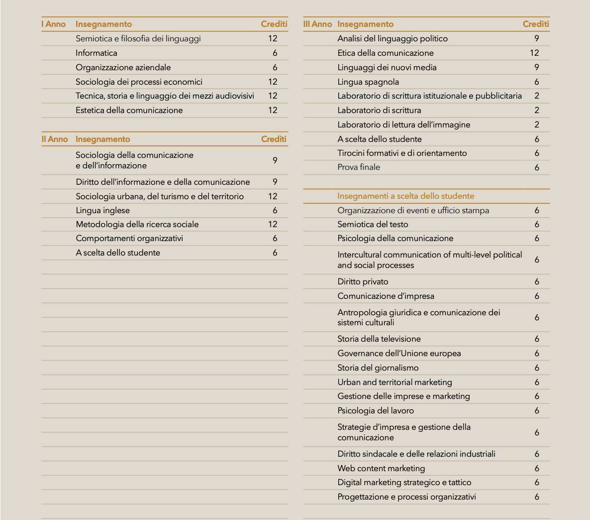 Il percorso di studi si struttura su tre anni: il primo anno è caratterizzato dalla presenza di discipline sociologiche, informatiche e semiotiche, affiancate da insegnamenti metodologici ed economico-organizzativi; il secondo anno rafforza i contenuti sociologici, organizzativi e metodologici, introducendo l'ambito giuridico; il terzo anno prevede materie filosofiche, politologiche e semiotiche, con marcata attenzione ai linguaggi della comunicazione. Lo studente ha la possibilità di sostenere alcuni esami a scelta. Sono previsti tirocini formativi e di orientamento.