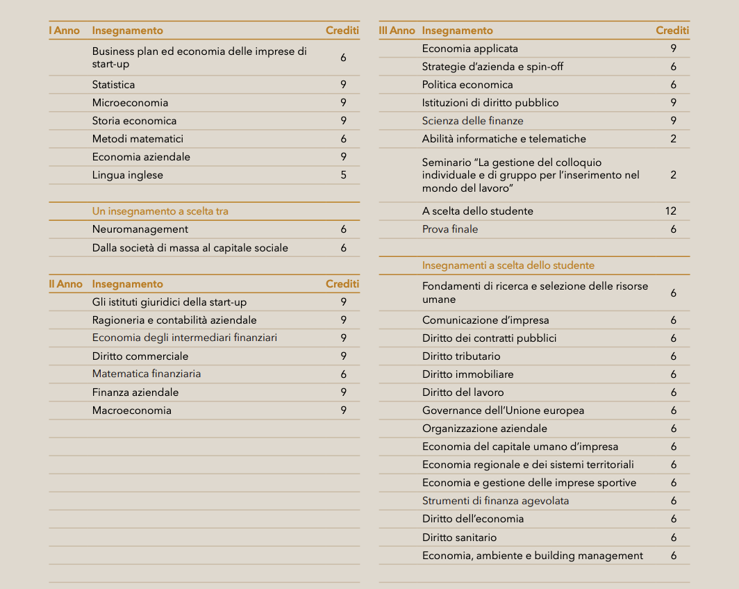 Il percorso di studi in Start-up d'Impresa e Modelli di Business è strutturato in modo da coniugare l'efficace apprendimento delle conoscenze di base e di metodo nelle materie economiche con l'acquisizione di competenze in grado di rispondere ai bisogni sempre nuovi espressi dal mercato, con particolare riferimento al settore delle start-up innovative. Il percorso di studi consente al laureato in Start-up d'Impresa e Modelli di Business di acquisire le conoscenze necessarie all'elaborazione di idee imprenditoriali e di progetti di start-up, nonché alla comprensione dei meccanismi che spingono gli attori economici a investire in una determinata idea di impresa.