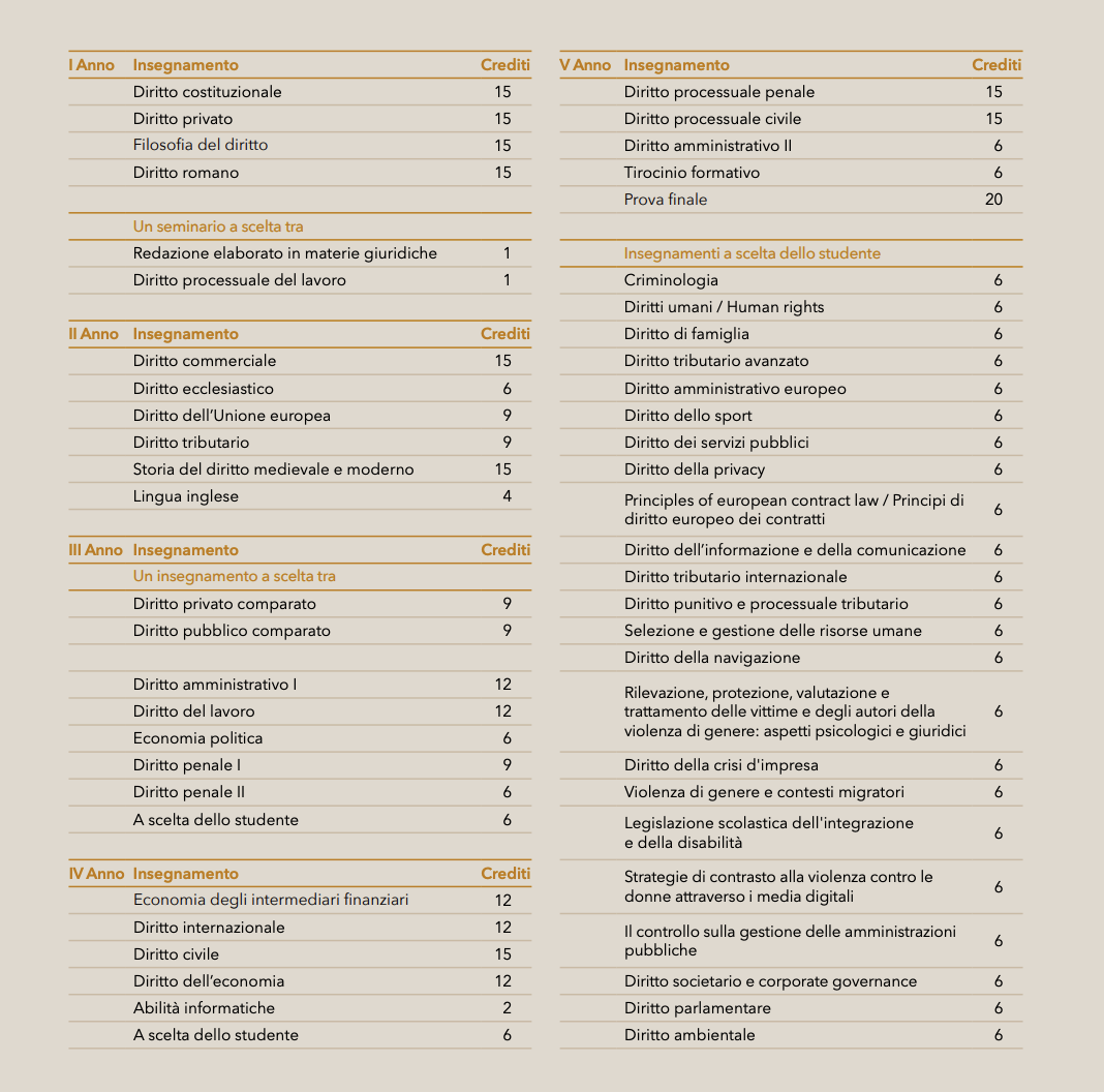 Il corso di laurea magistrale in Giurisprudenza è strutturato in modo da offrire agli aspiranti giuristi una cultura tematica di base, sia in campo nazionale sia in quello europeo. È parte degli obiettivi formativi qualificanti del corso di laurea anche l'acquisizione delle capacità necessarie alla produzione di testi giuridici (normativi, negoziali e processuali) chiari, bene argomentati, pertinenti ed efficaci in rapporto ai contesti di impiego. La laurea magistrale in Giurisprudenza consente l'accesso ai successivi percorsi formativi, quali master, dottorati di ricerca e scuole di specializzazione per le professioni legali. La laurea, inoltre, costituisce titolo per la partecipazione ai concorsi di magistrato, notaio e all'esame di avvocato, previo espletamento del periodo di praticantato previsto dalla normativa vigente.